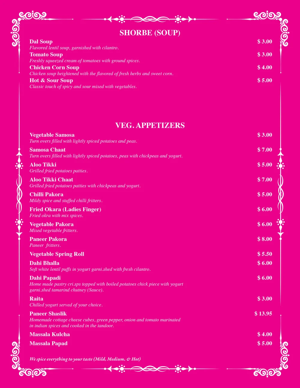 Our Menu Our food is prepared in a style which blends the finest oriental spices to produce a variety of subtle and exotic flavours without over spicingAlso our menu includes only the. We welcome you to try the Indian spices around the world. Spring Chicken marinated in a mix of.